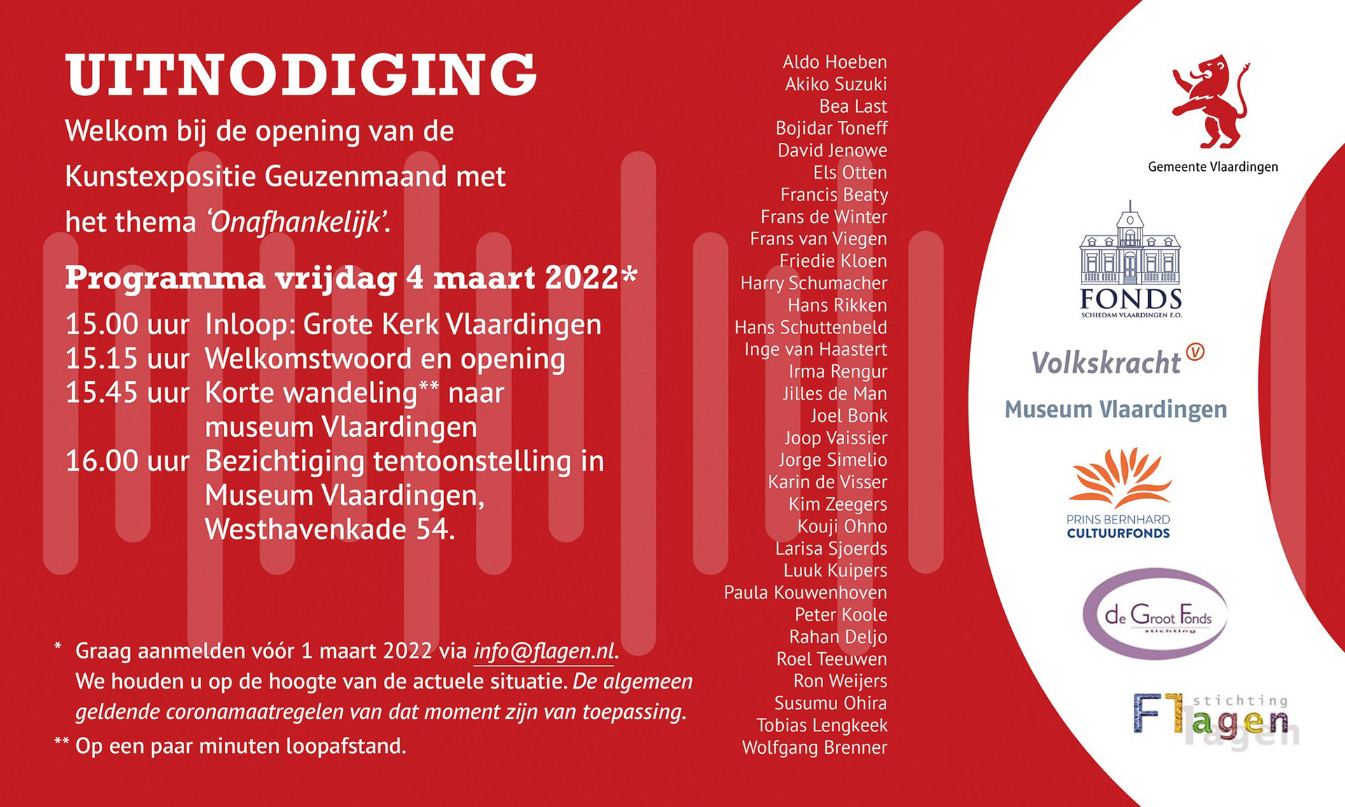You are cordially invited to attend the official opening of the last Geuzenmaand 2022 exhibition 'Onafhankelijk' at the Korenbeurs in Schiedam on Sunday November 13 2022 - 2.30 till 6 PM. De Korenbeurs - Lange Haven 145 – Schiedam – the Netherlands. The actual Geuzenmaand exhibition will be on display at Stichting Kunstwerkt at Art Centre Schiedam - Lange Nieuwstraat 191 in Schiedam.